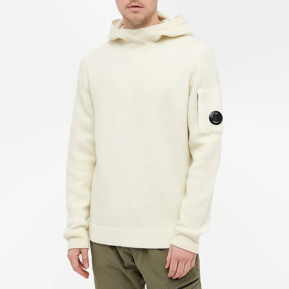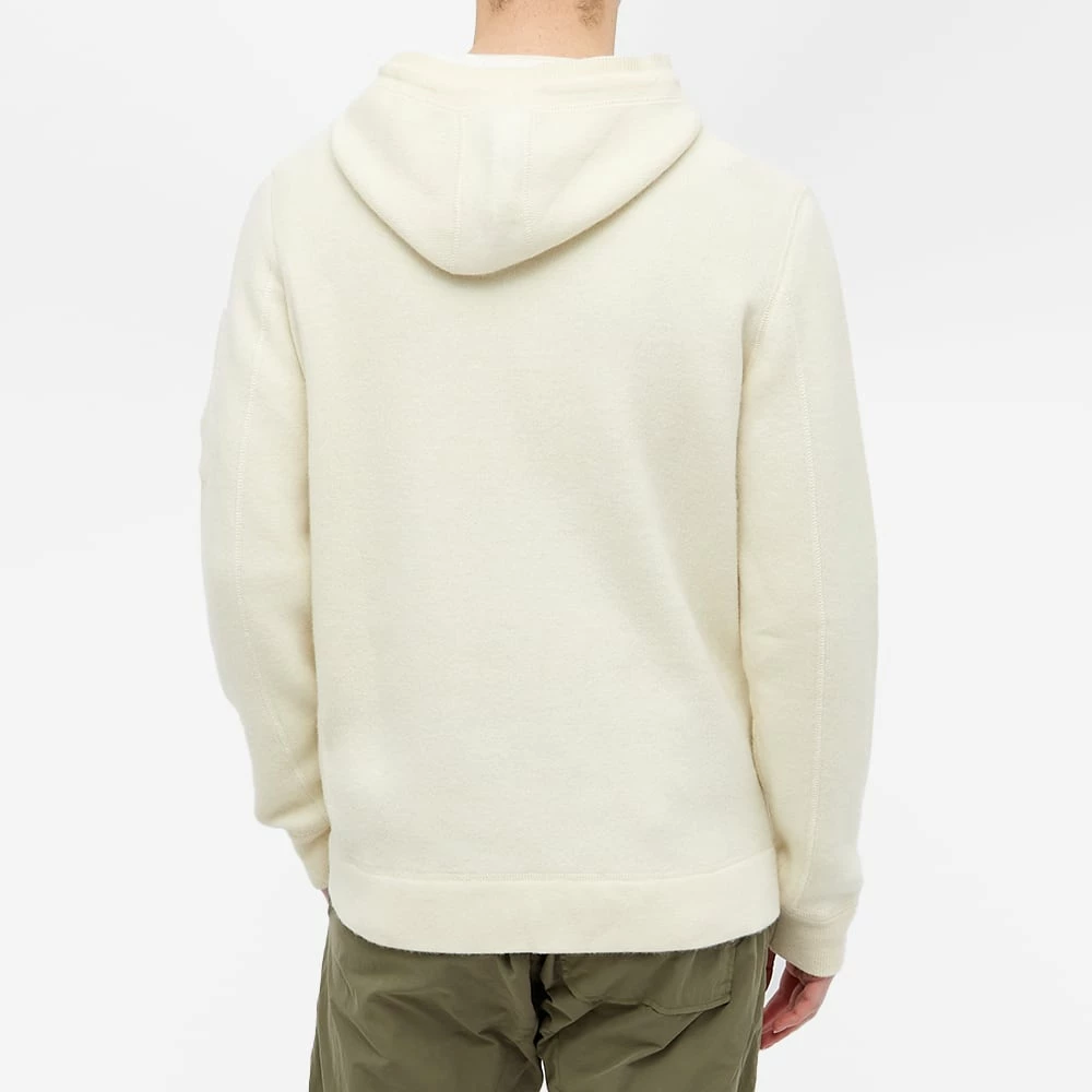 Keep warm in your casual outfits with this hoody from C.P. Company. Arriving in an off-white colourway, it’s double knitted from lambswool for a super-soft feel, then fitted with a funnel neck hood for extra warmth. To finish, it’s detailed with a black lens – the label’s signature feature – on the sleeve pocket.