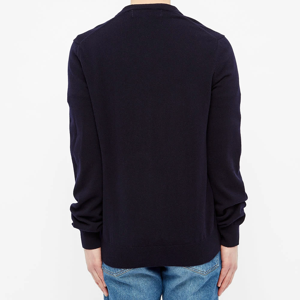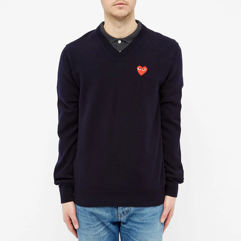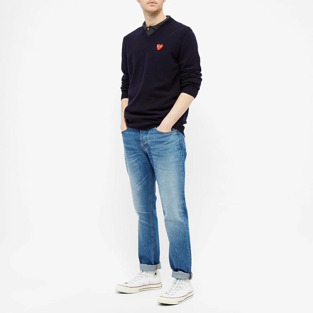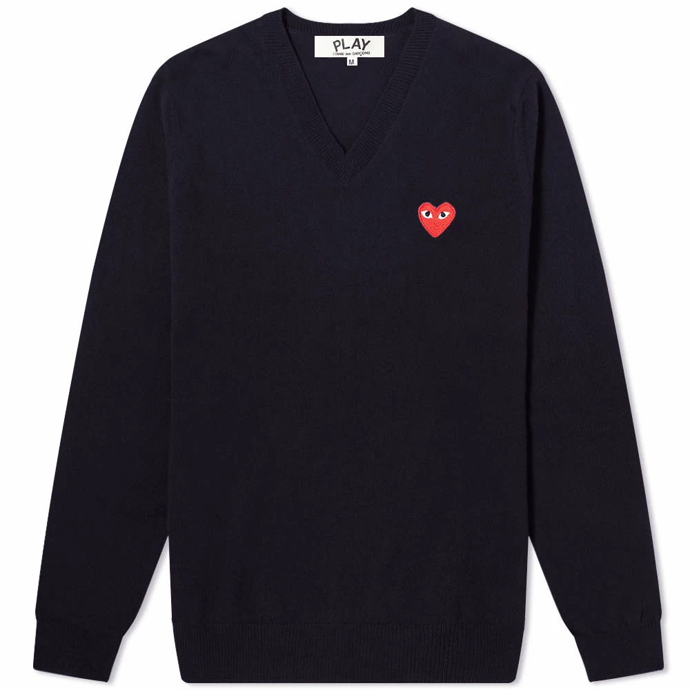 Filip Pagowski’s bug-eyed heart motif sits proudly at the chest of this navy blue Comme des Garcons PLAY jumper. Made in Japan using pure wool, it’s sure to keep you snug with every wear.