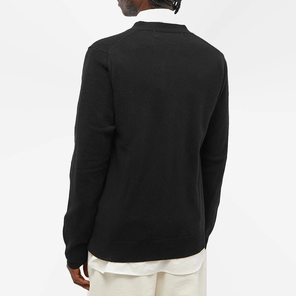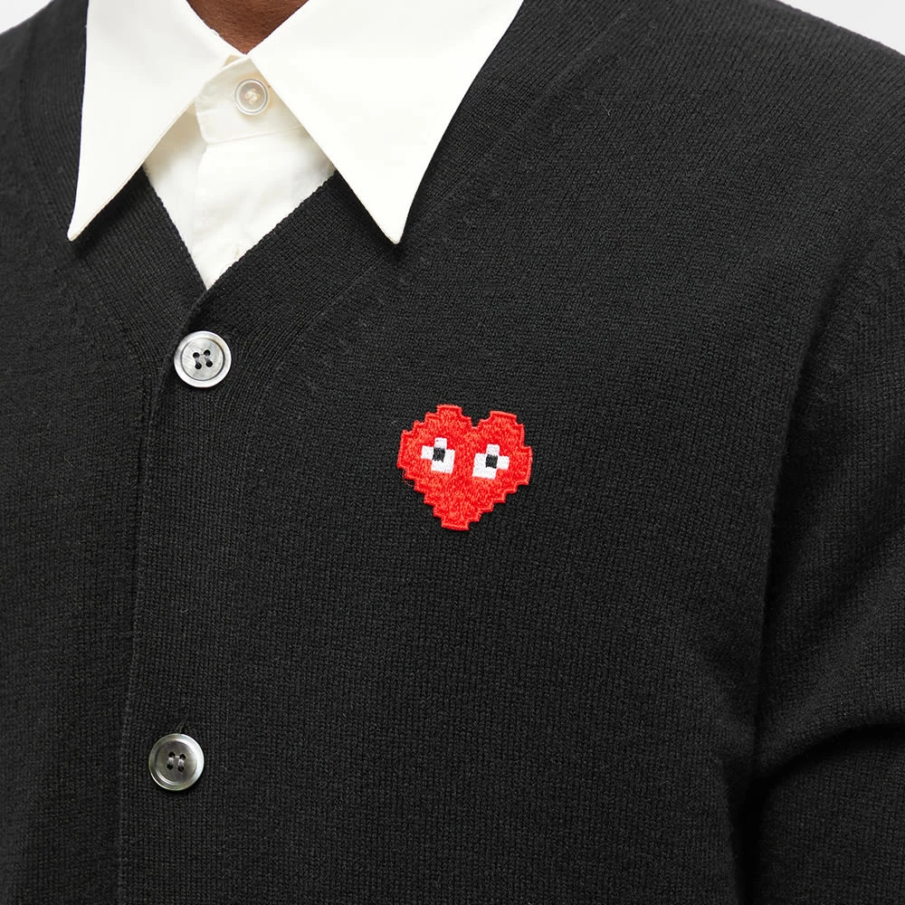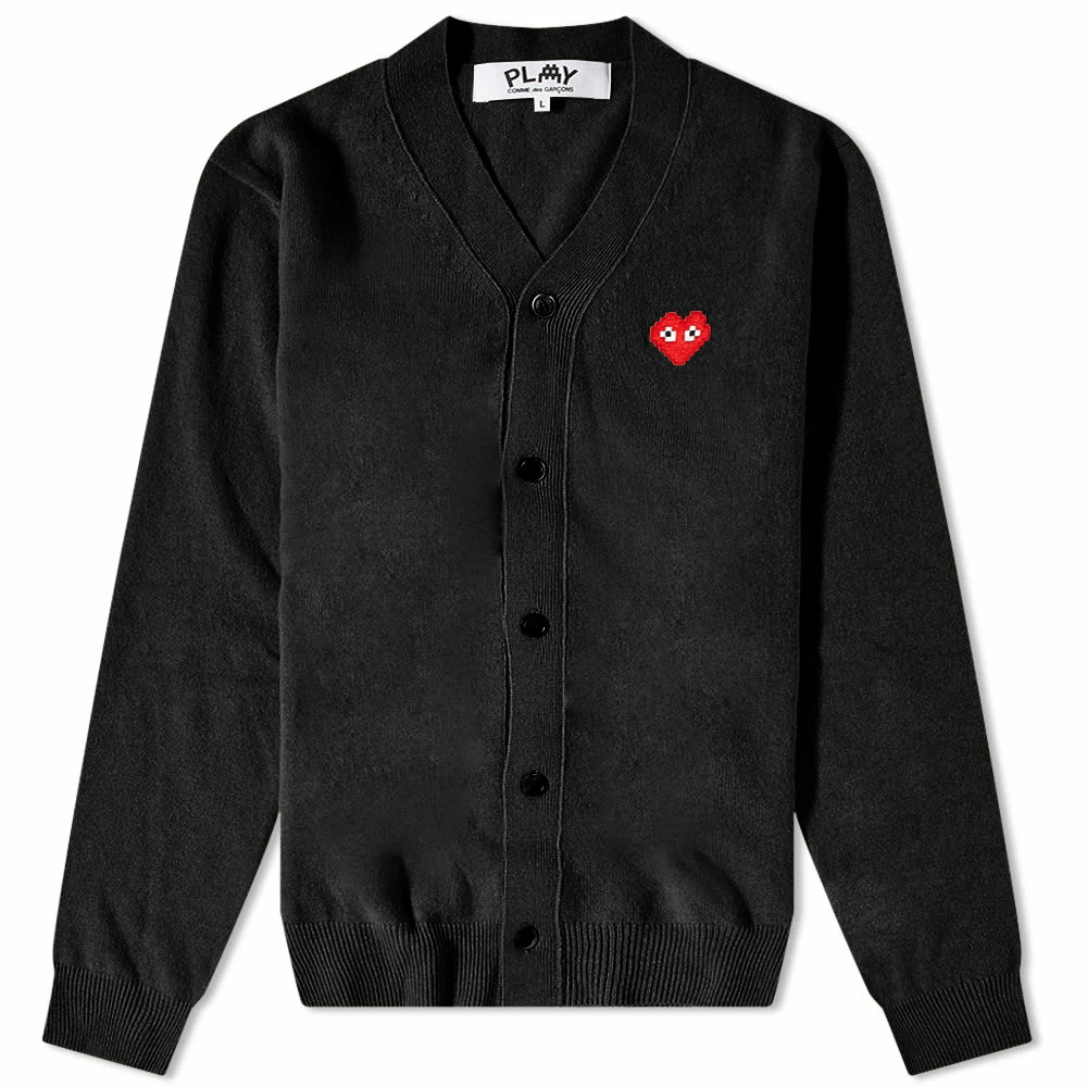 The black v neck cardigan – an essential knit in any wardrobe – is upgraded with Comme des Garçons PLAY’s signature – courtesy of Filip Pagowski. The iconic bug eyed mascot takes a trip to the arcade this season, teaming up with French street artist Invader, a pixelated iteration is appliqued in its usual spot at the chest.