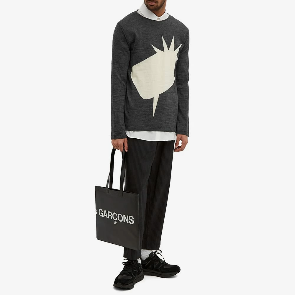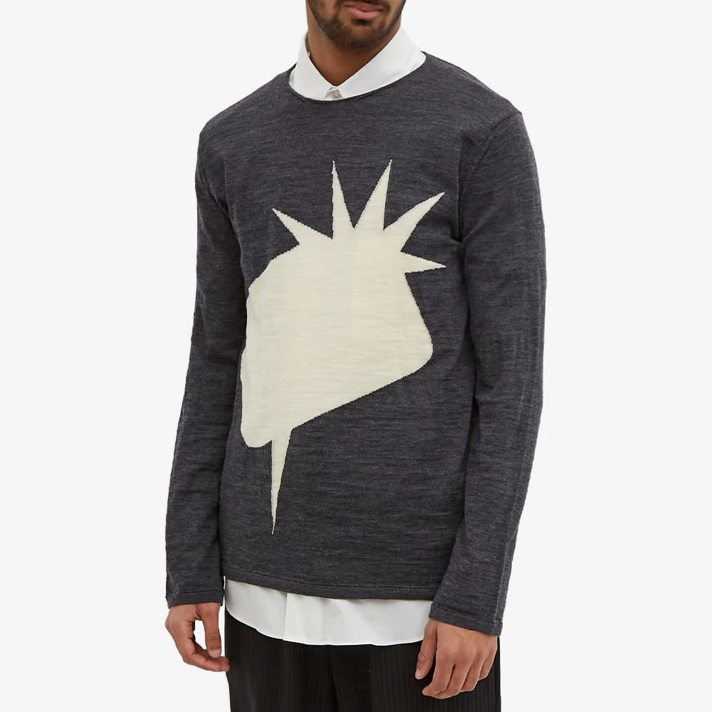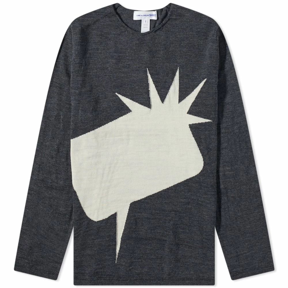 Comme des Garçons SHIRT goes bolder than usual with this grey graphic sweater. Knitted from pure wool, it sports a raw edge crewneck collar for an effortless look and features a pop art style bubble graphic woven at the front for a quirky finish.