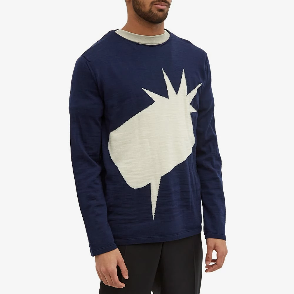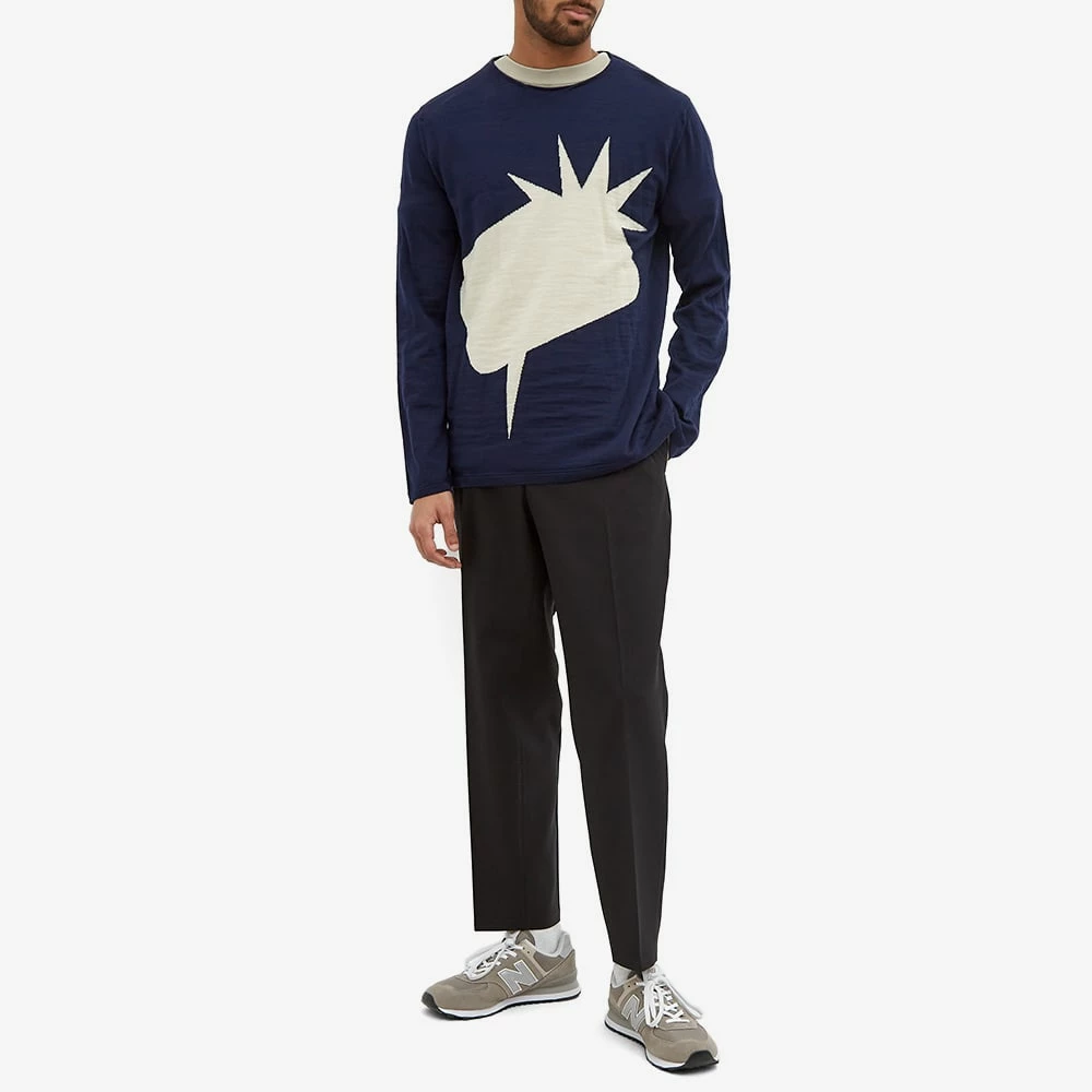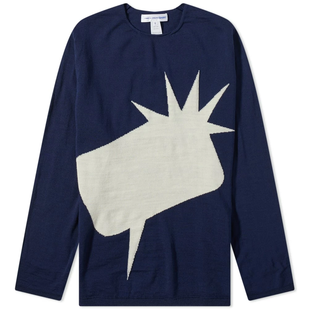 Comme des Garçons SHIRT goes bolder than usual with this navy graphic sweater. Knitted from pure wool, it sports a raw edge crewneck collar for an effortless look and features a pop art style bubble graphic woven at the front for a quirky finish.