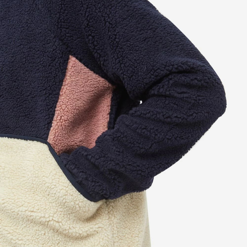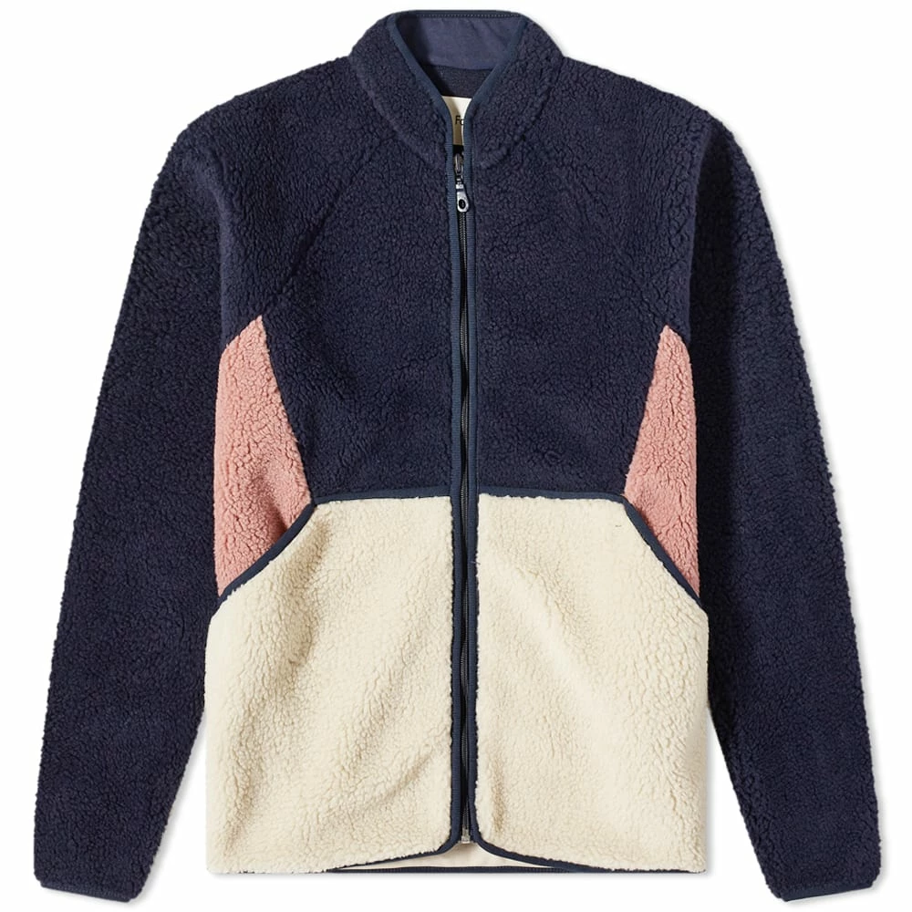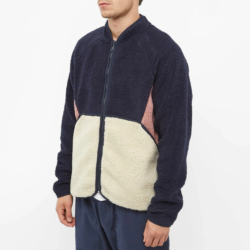 Stay snug and stylish with this navy fleece from Folk. Crafted from a soft fleece fabric, it’s fitted with a zip closure – to help keep out the chill – and sports cream and pink panelling to finish.