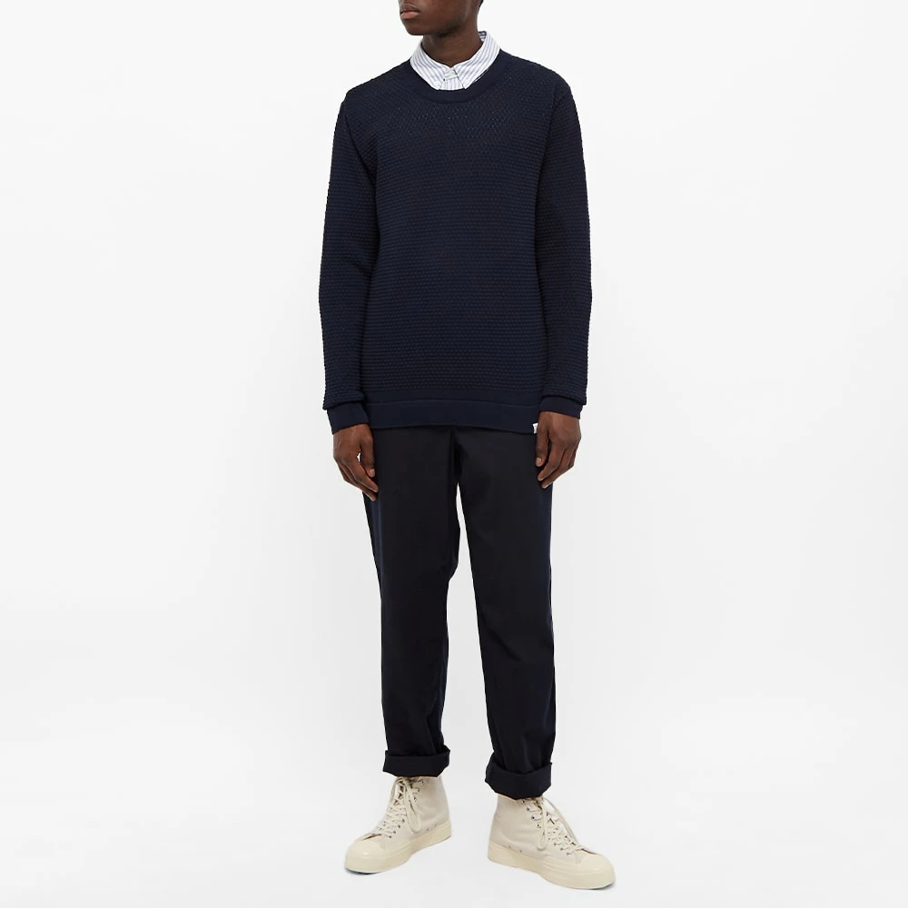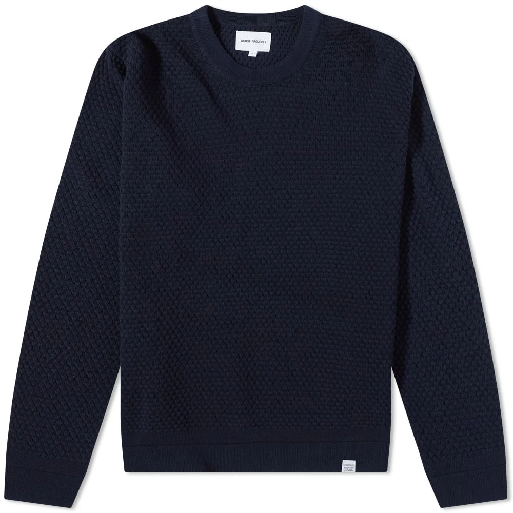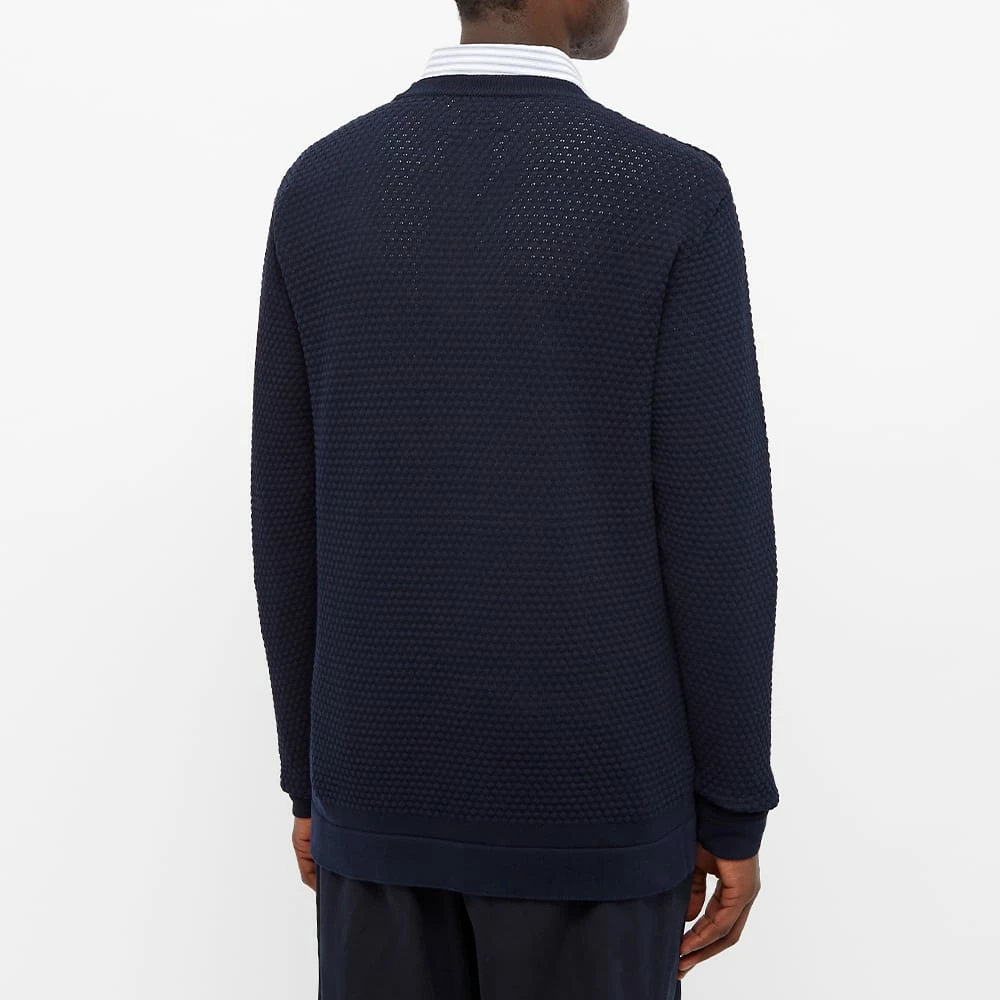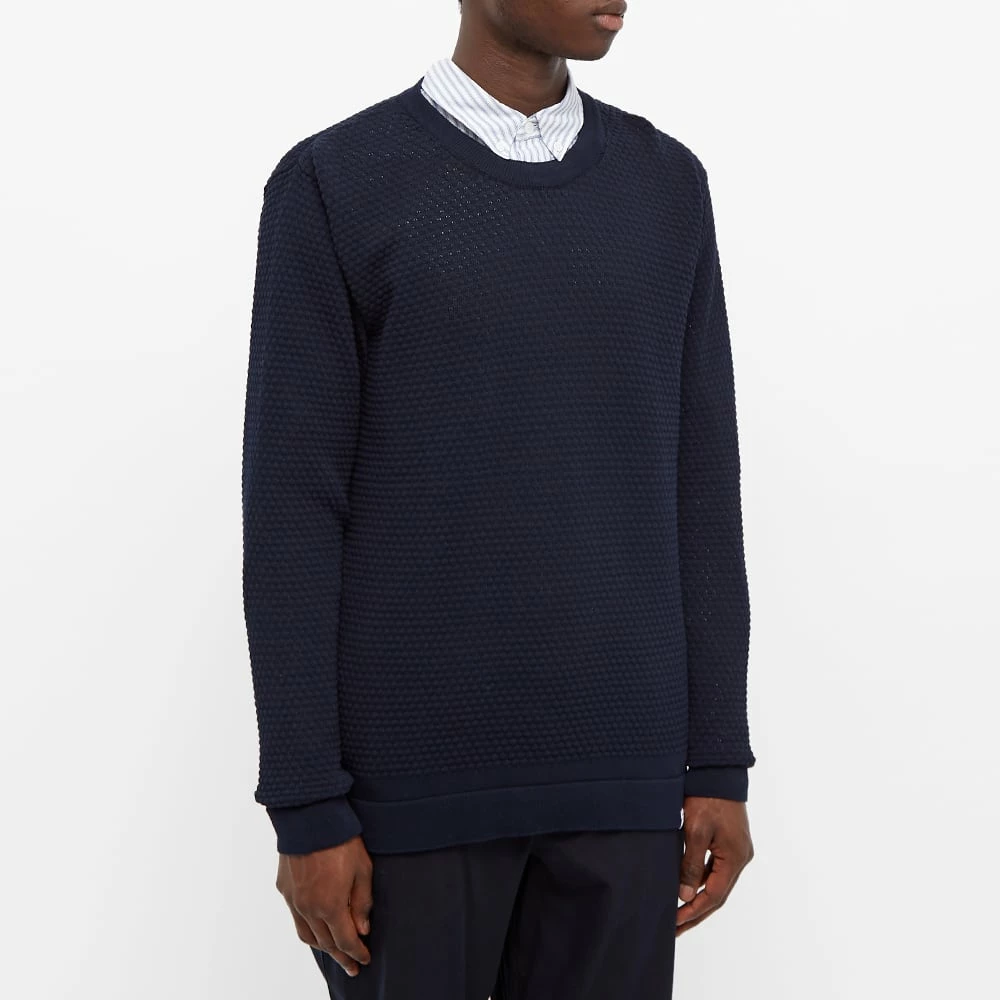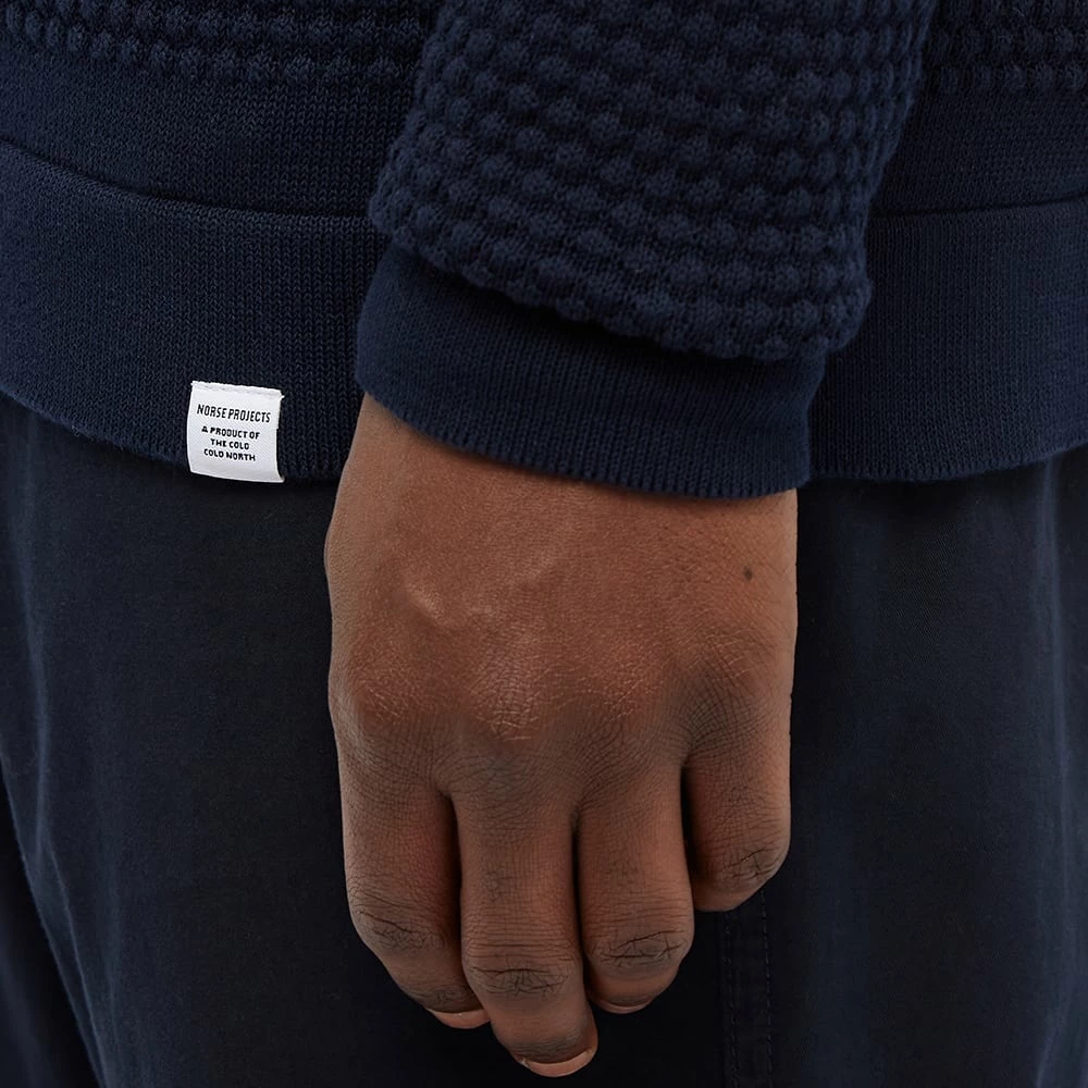 Inspired by traditional Danish fishing garb, Norse Projects offers this luxe navy knit. Knitted from cotton crépe yarn with a rich bubble texture, it’s fitted with set-in sleeves and tubular trims for a snug finish.