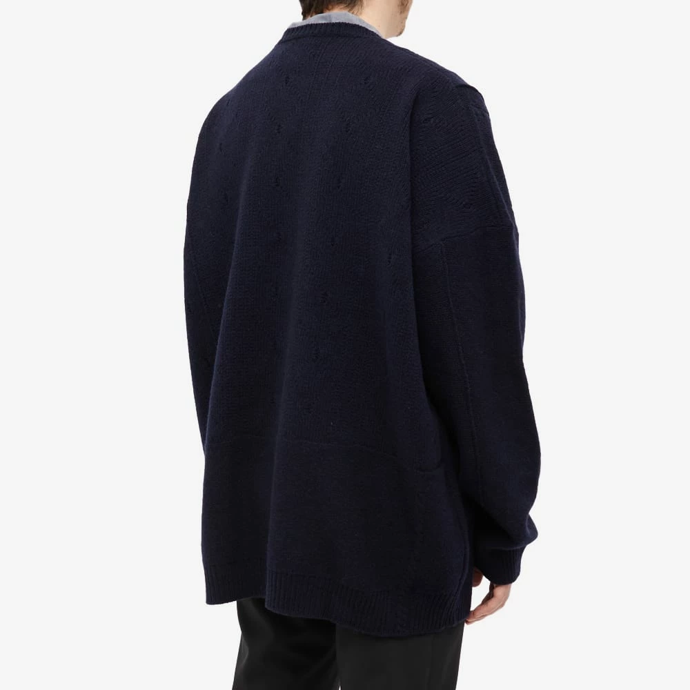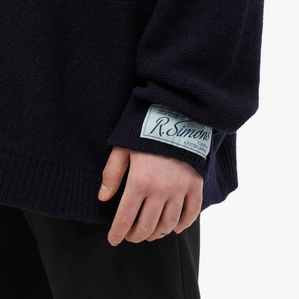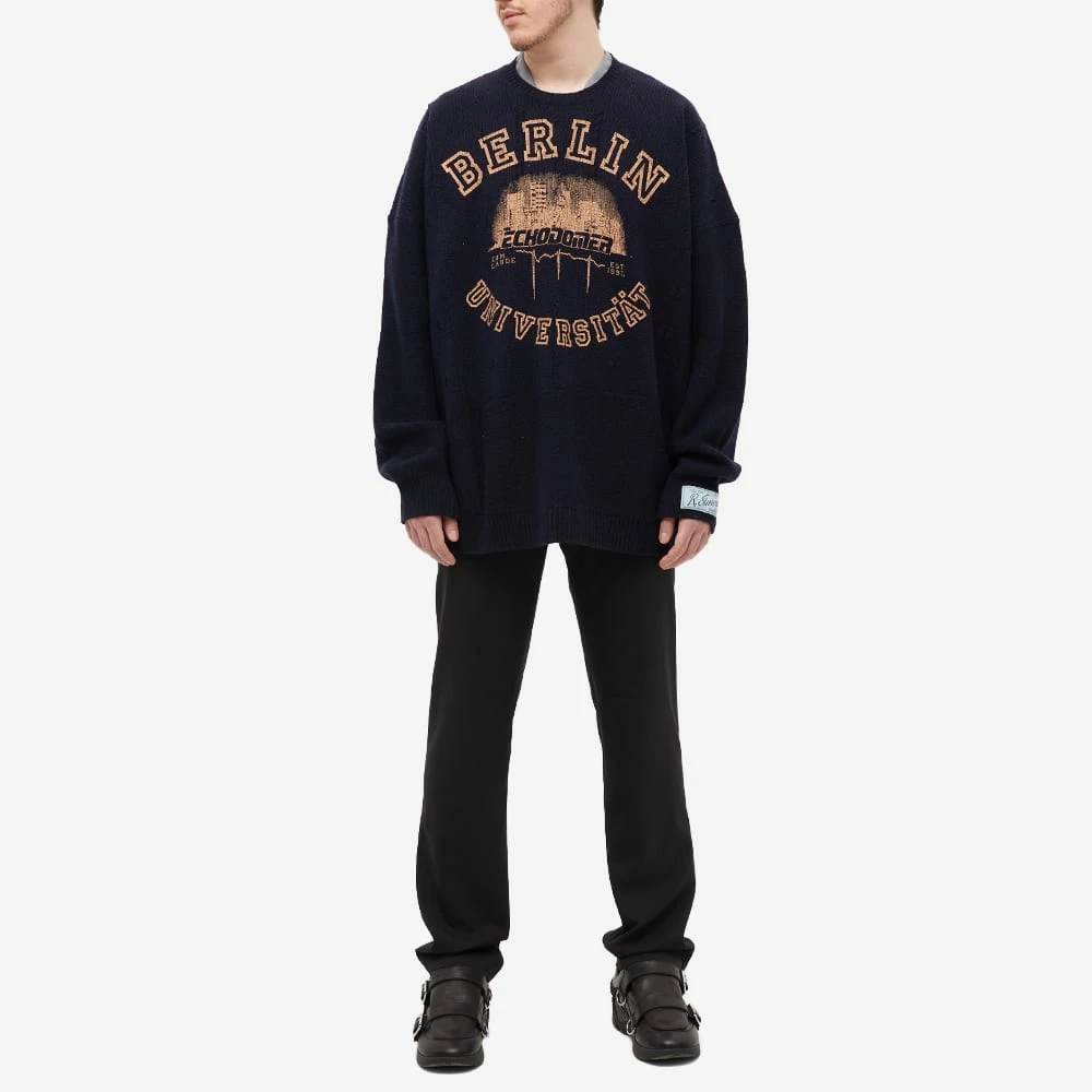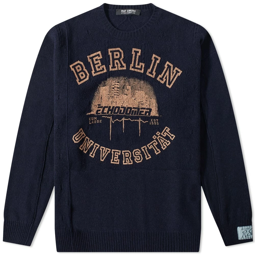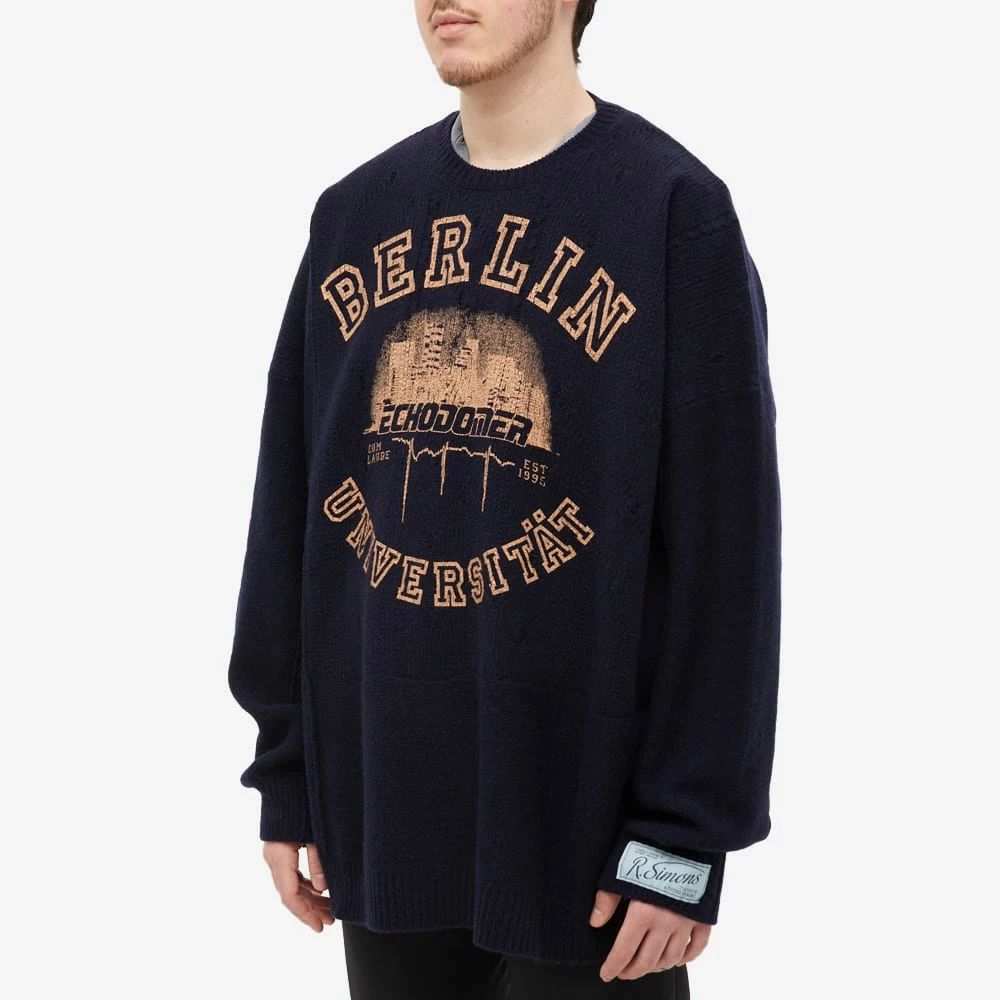 Channel Raf Simons avant-garde contemporary aesthetic with this navy sweater. Knitted from super-soft merino wool, its oversized silhouette is complete with collegiate-style Berlin branding and unique exposed seam detailing for a subtle deconstructed look.
