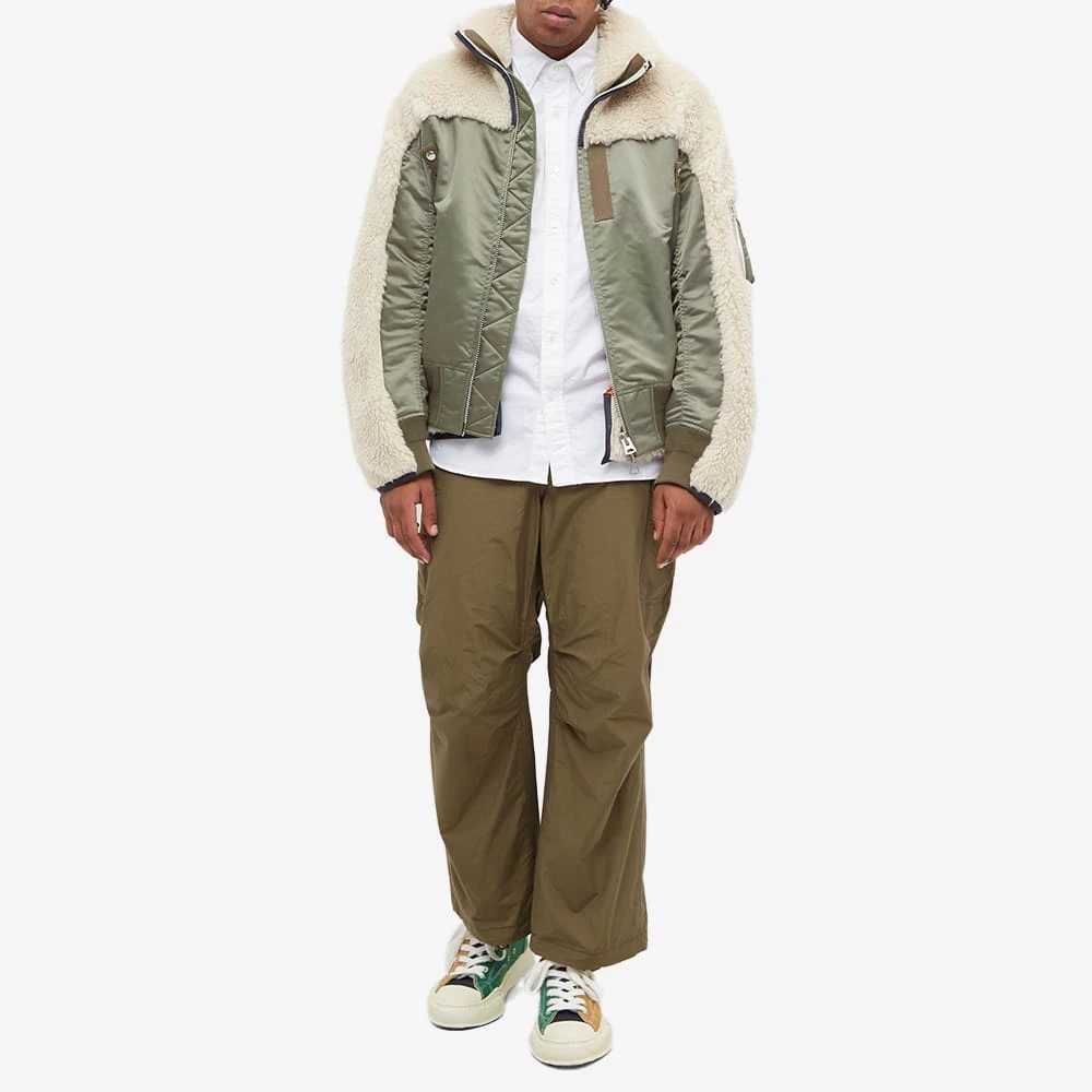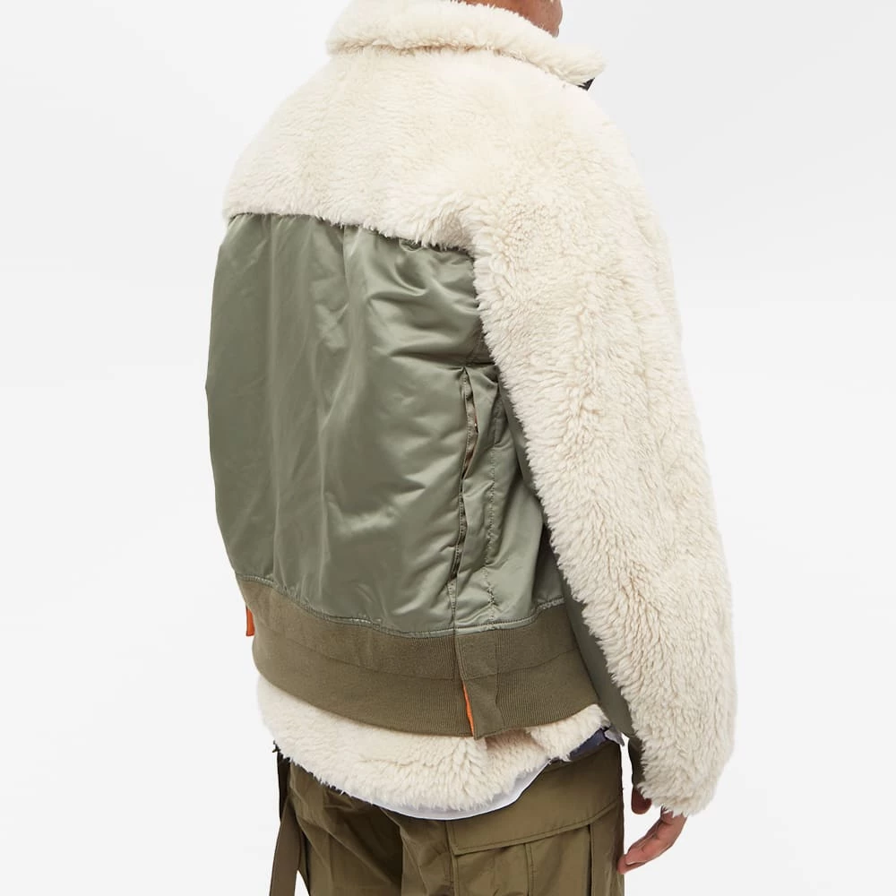 Chitose Abe, designer of cult Japanese label Sacai, was previously a pattern cutter and takes an experimental approach, re-evaluating typical silhouettes and using contrasting textures, just like this green fleece jacket. Signatures of a classic bomber jacket are deconstructed and patch-worked together with soft wool fleece.