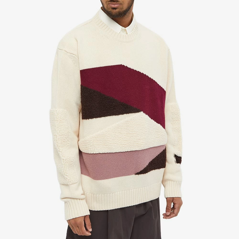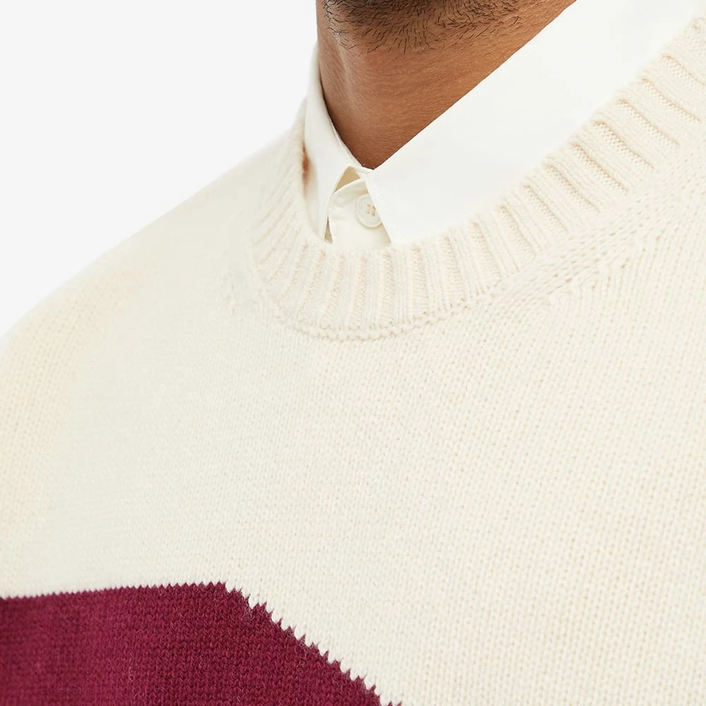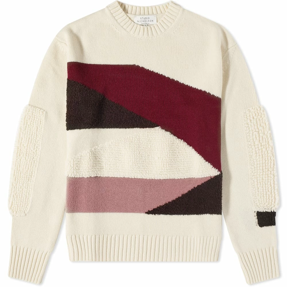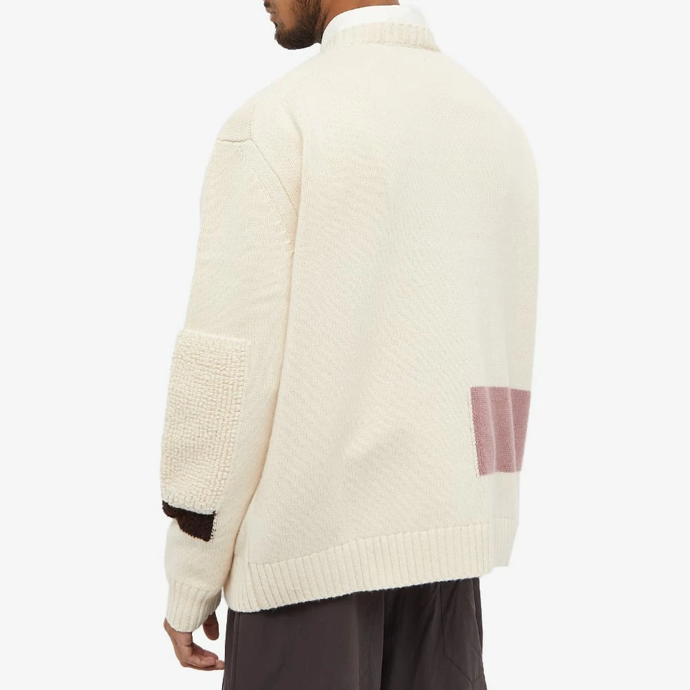 Characterised by its architecture-inspired pattern, this neutral-coloured crew knit from Studio Nicholson showcases the London labels signature European-style with a contemporary edge. The oversized silhouette is crafted from a super-soft lambswool-blend and comes complete with contrast textured patches at the sleeves – nodding to modern-day tailored styles.