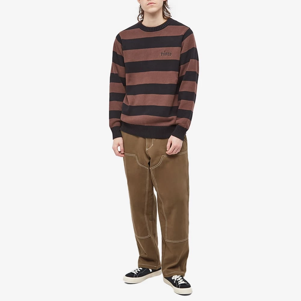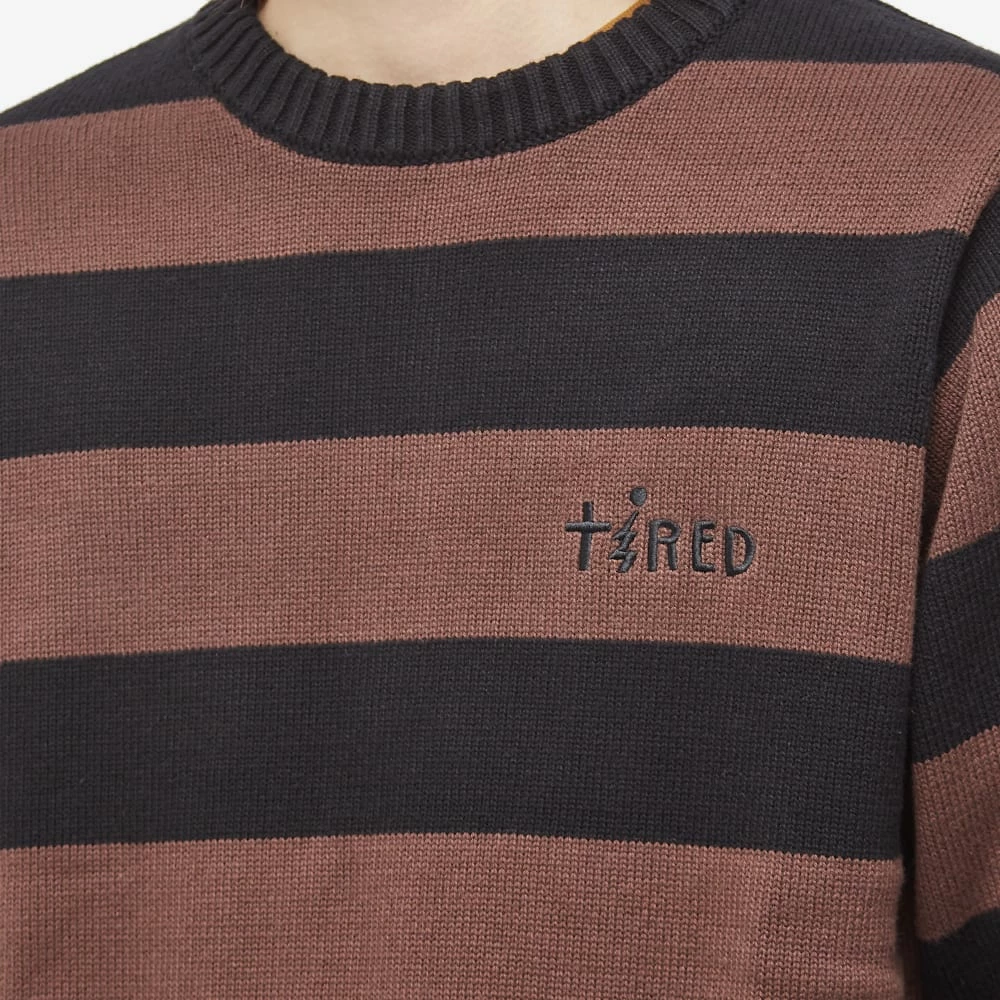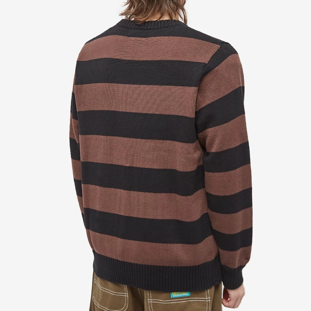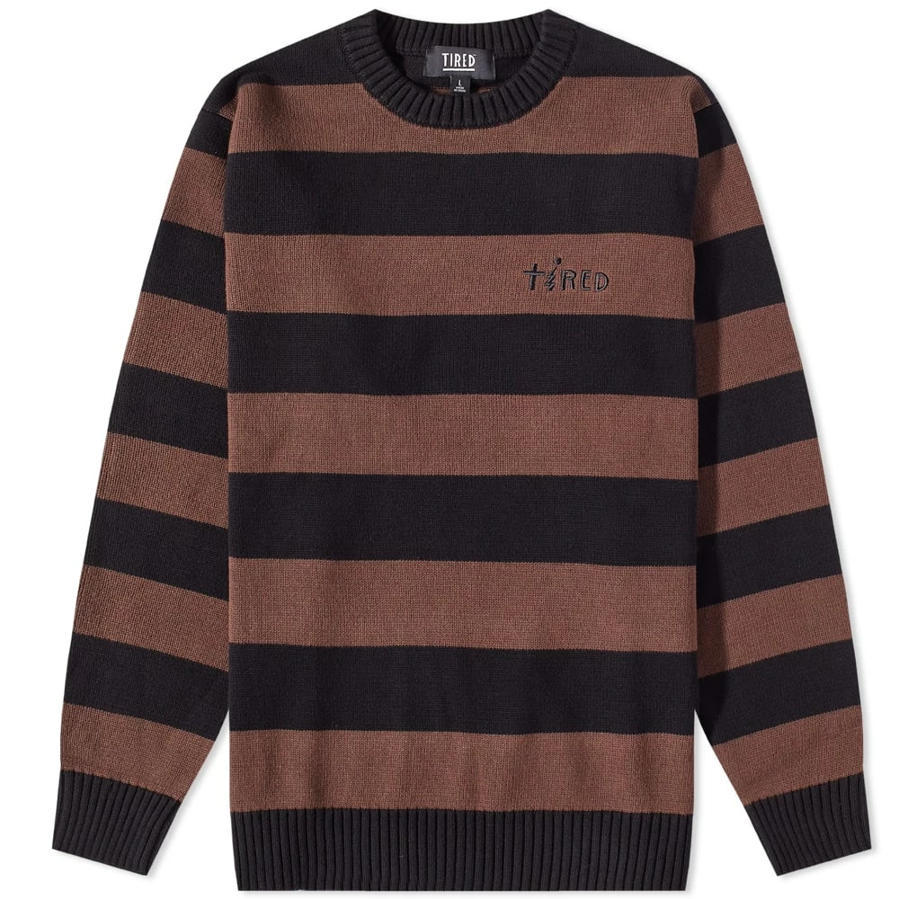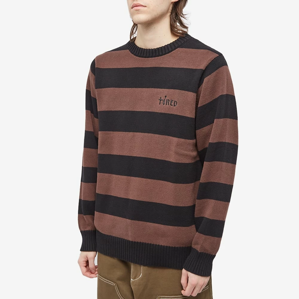 Tired Skateboards collections are designed with respect for the die-hard skateboarders, enriched with a sense of humorous and contemporary creativity. This Jolt sweater is a bold new addition for AW22, it’s woven with a custom black and brown stripe throughout, then the signature lightning-bolt logo embroidered at the chest finishes it off.