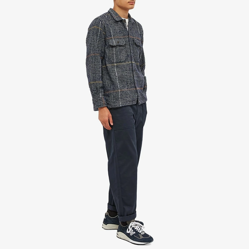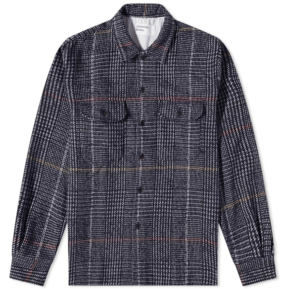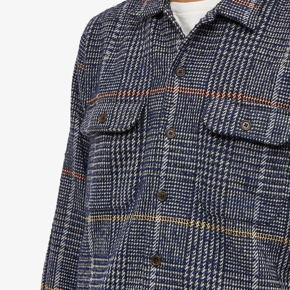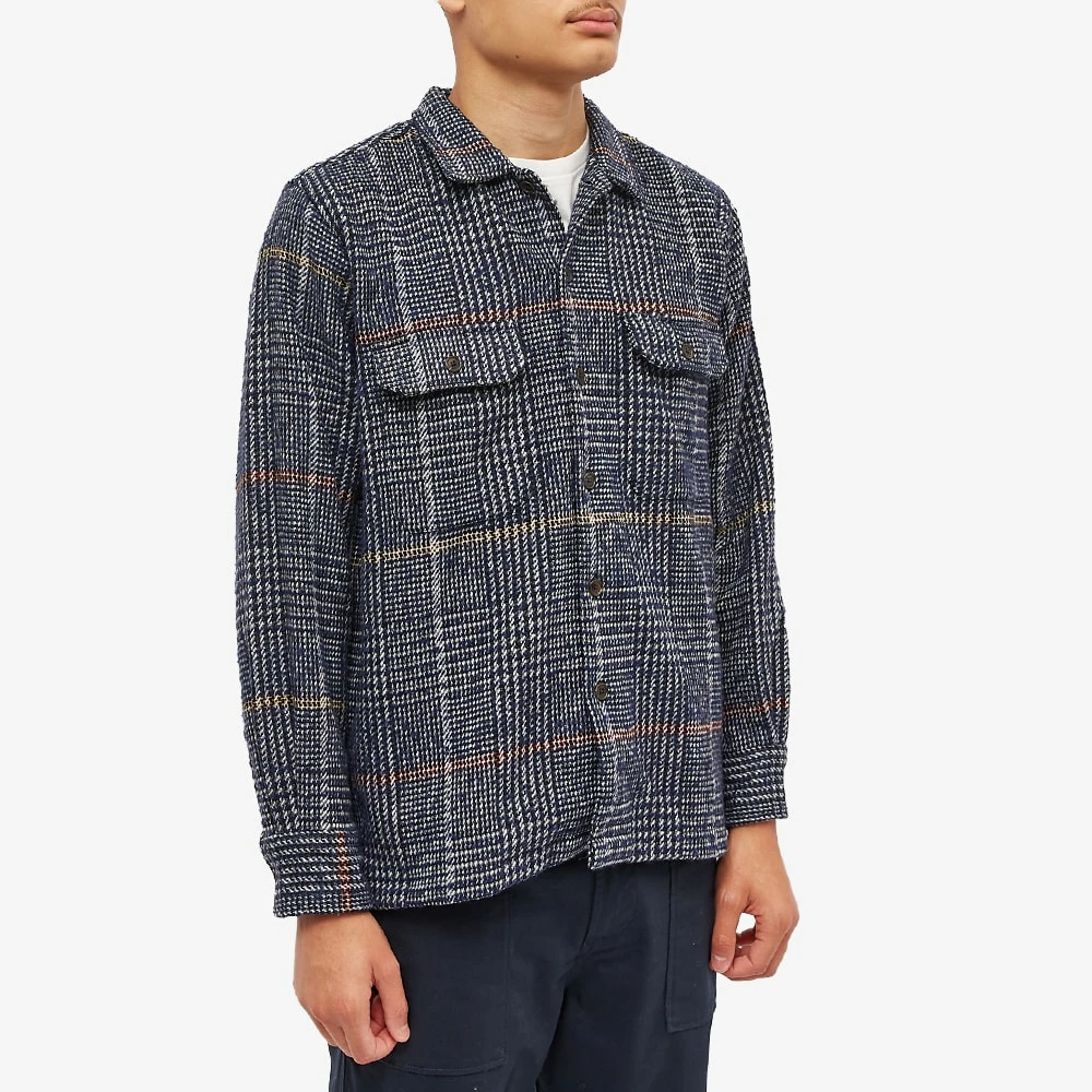 Inspired by a visit to a Japanese fast food joint, this is the Universal Works version of a mid-century inspired American garage work shirt. Woven in Italy by a recycled fibres specialist, this overshirt is decorated with a striking navy checked pattern.