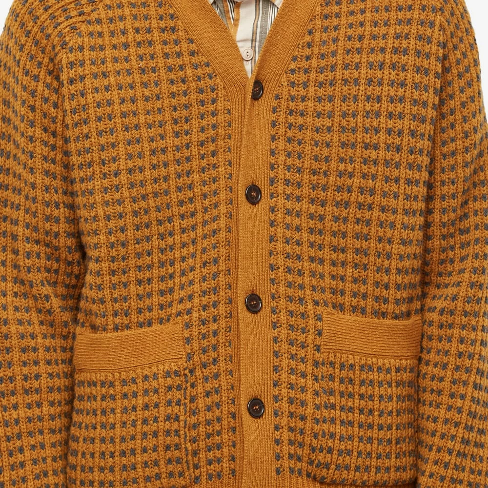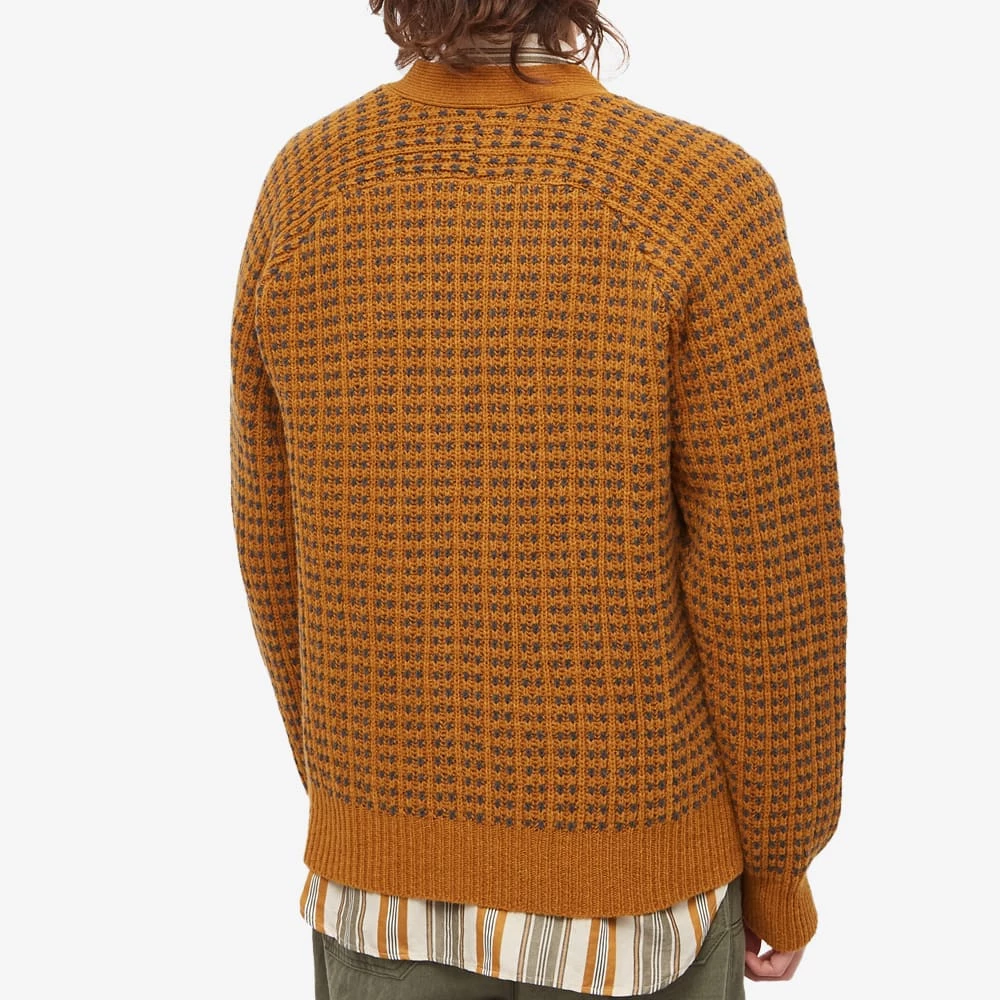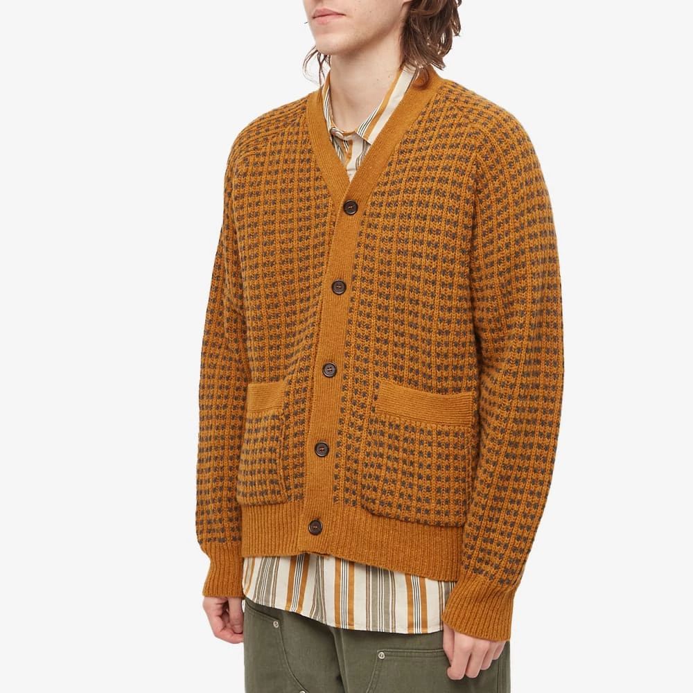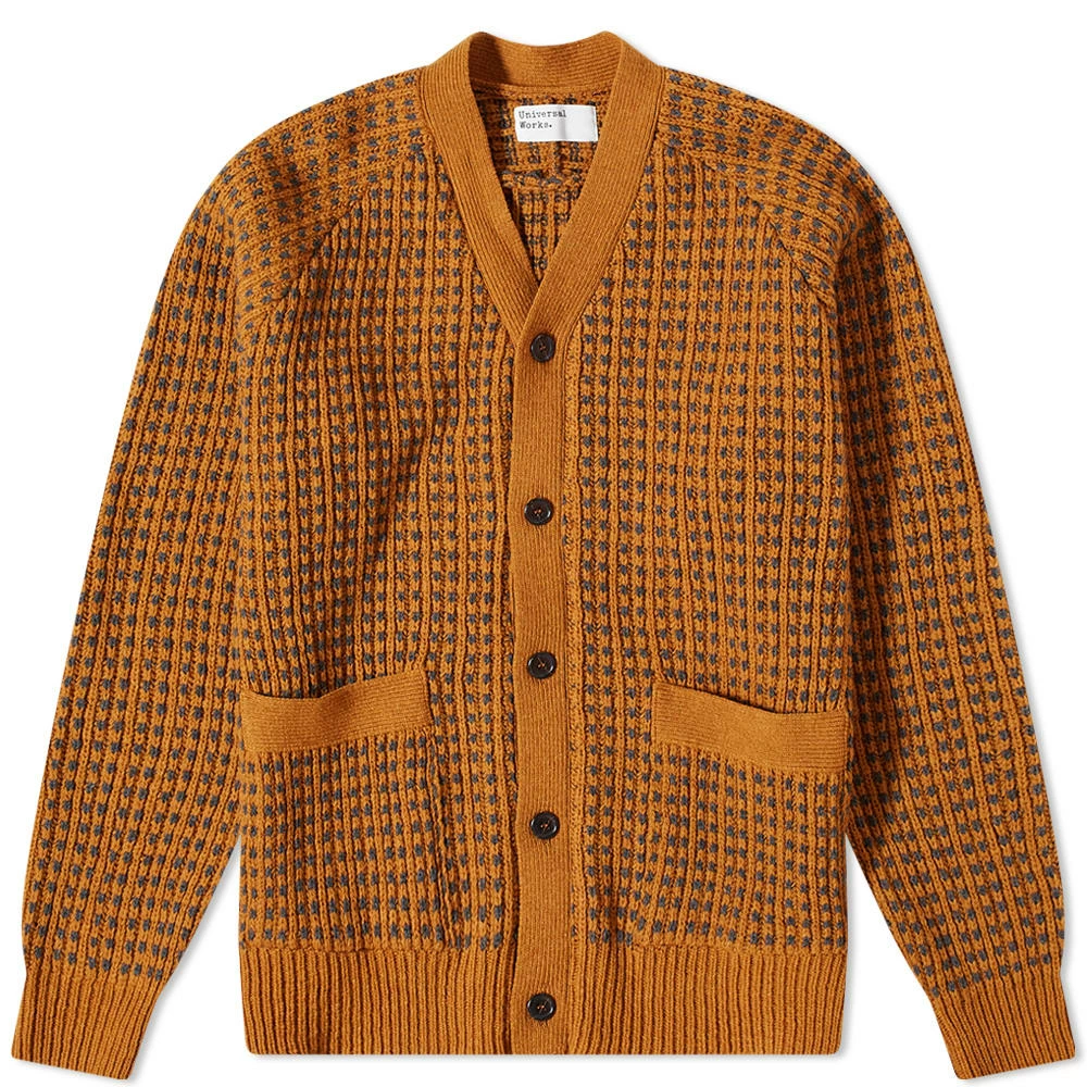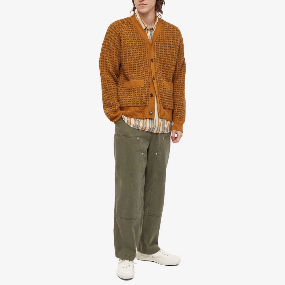 Crafted by Italian experts Lanarossi for Universal Works, this patterned cardigan features a simple five-button down front with a classic v-neck. Made with a sophisticated yarn and decorated in a cumin and grey check.